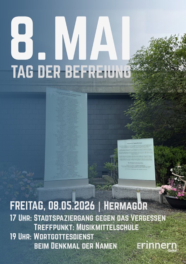 Ein Jahr nach der Errichtung des Denkmal der Namen in Hermagor, laden wir am Tag der Befreiung vom Nationalsozialismus, dem 8. Mai, zu einer gemeinsamen Gedenkveranstaltung.